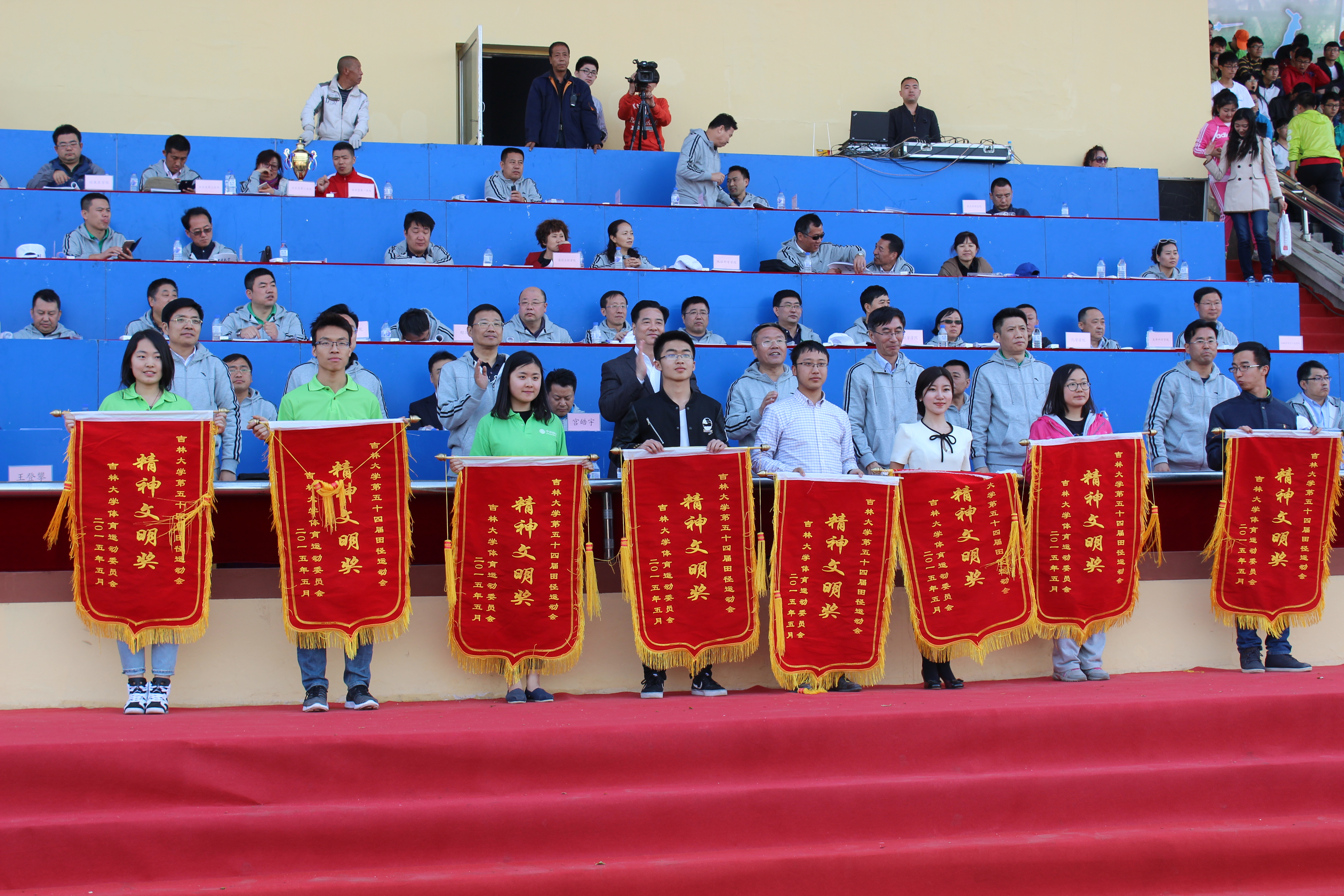下午3点40分举行77779193永利官网第54届运动会的闭幕式,并在闭幕式上宣读精神文明奖的获奖团体,77779193永利官网获得宣传报道奖、文艺表演奖、精神文明奖三项殊荣,77779193永利官网团委书记兼12级辅导员荣诗达老师上台领奖并和校领导合影留念。