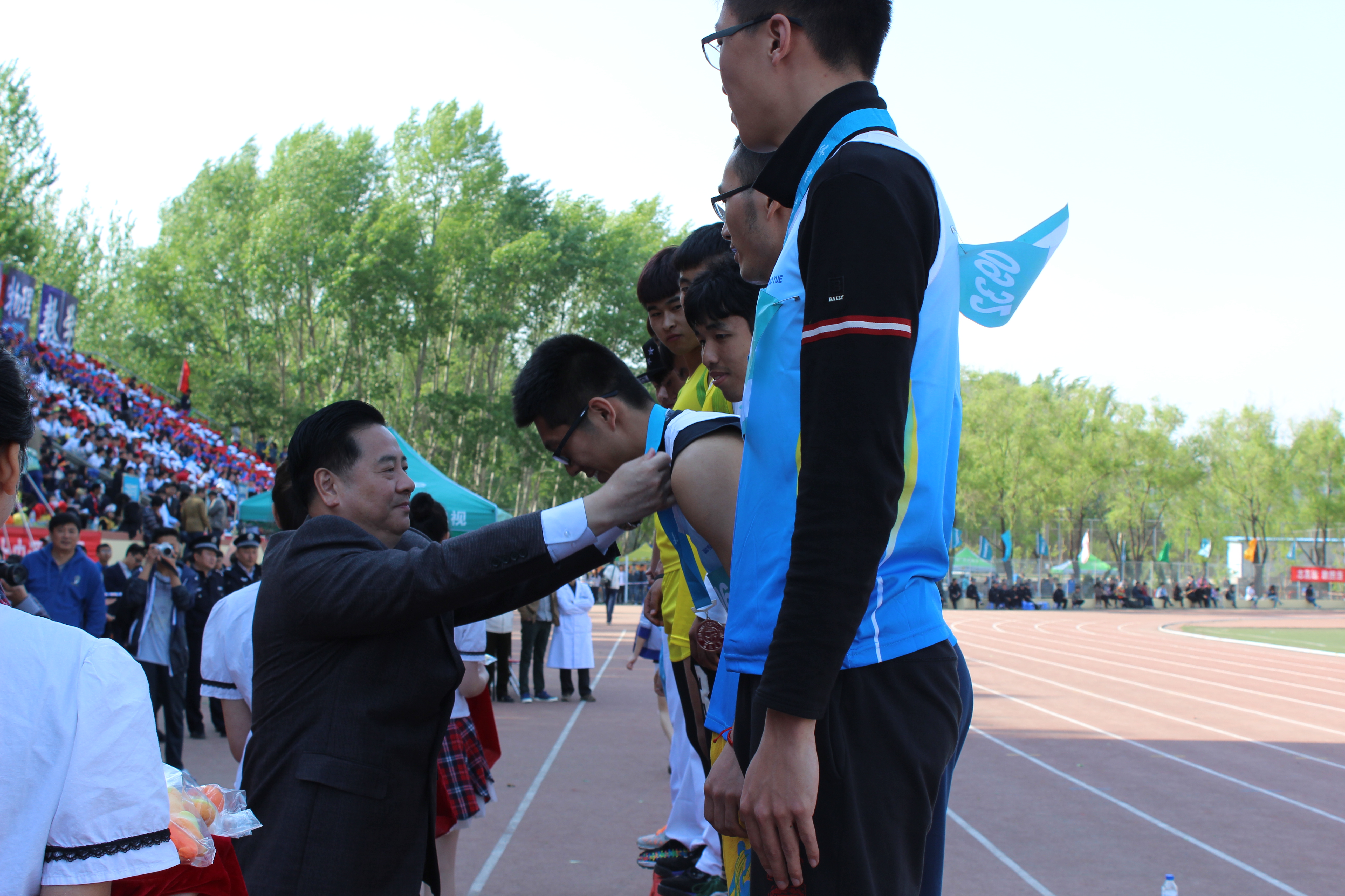 男子4*400米接力赛的颁奖典礼在下午3点10分举行,此次颁奖的嘉宾是:77779193永利官网校长李元元院士,体育学院院长袁雷教授。校长亲切的和他们握手并颁发奖牌,袁教授为他们颁发此次运动会的纪念品玩偶,并在最后留影合念。此刻,77779193永利官网代表队的同学们脸上洋溢着幸福灿烂的微笑。