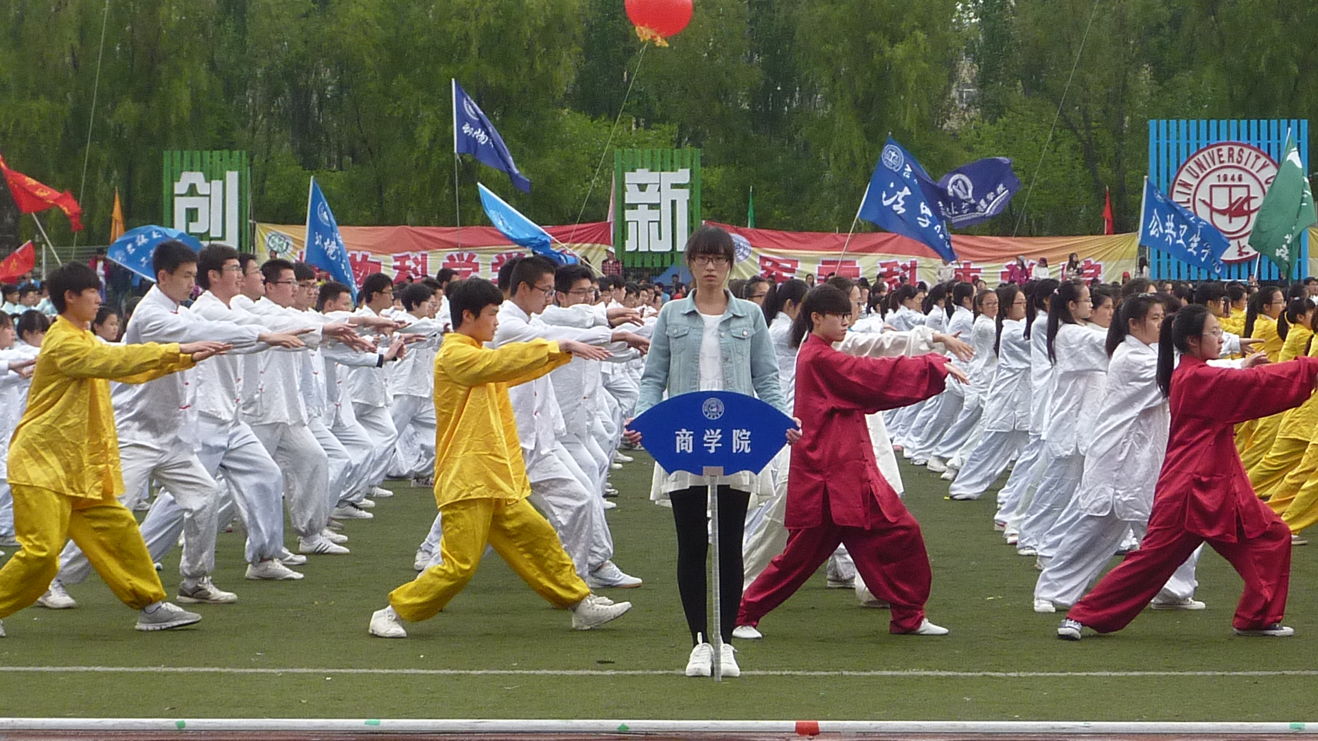 商院太极队伍呈两路纵队位列体育场中央。天空虽乌云密布,但这丝毫没有影响到方队成员的积极投入。白衣随风飘动,方队成员随着悠扬婉转的音乐起式、转身、移步,一招一式流畅贯通。从远处看,似一道道优美的弧线划过,却不着丝毫痕迹。轻盈却扎实的步子在地面上自由的划开,双臂推挡之间似有气流涌动。柔中带刚,力道并不猛冲而是化解在变换的步伐招式中。商院太极方队既与全校整支太极队伍融为一体,却也在展现商院人自己的精神风貌。野马分鬃、白鹤亮翅每招每势都恰到好处,整齐划一。