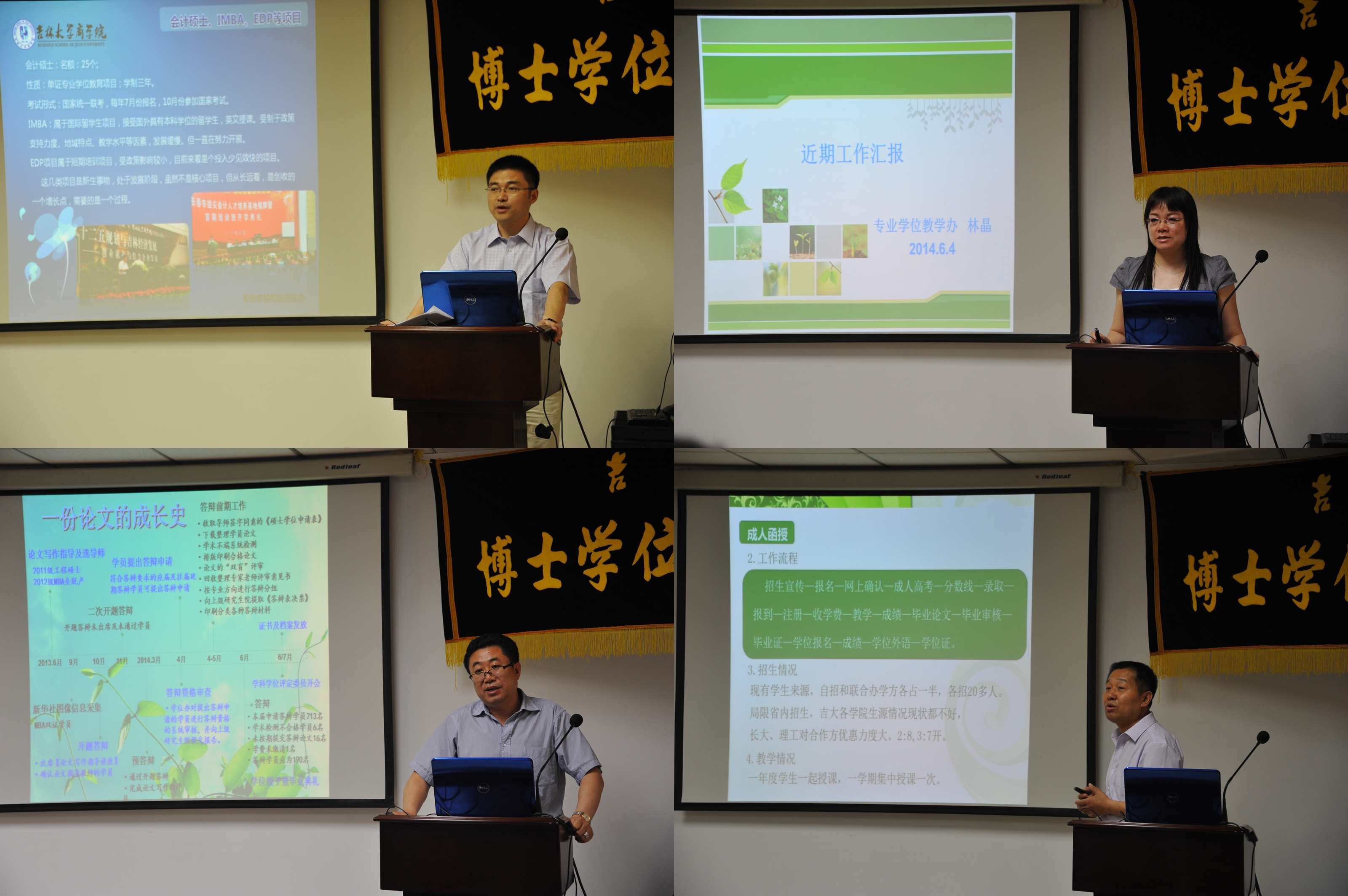 随后,专业学位招生办公室主任王世强、专业学位教学办公室主任林晶、专业学位办公室主任李怀日、继续教育办公室主任刘亚宾分别对目前本部门工作情况进行汇报。各位办公室主任通过PPT展示及丰富细致的阐述,清晰明了的表达了各自的工作内容和想法,同时与在座各位管理干部进行互动,对管理干部提出的问题一一解答,并对大家提出的合理建议和意见进行采纳。