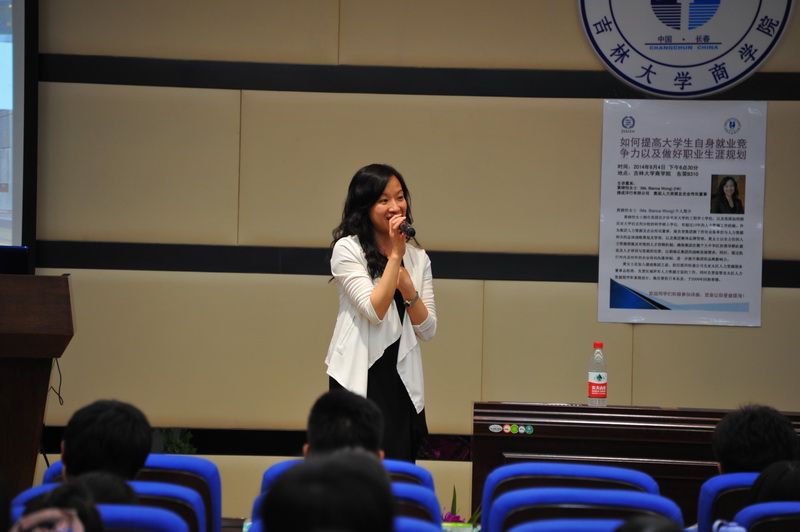 本次讲座的主题是“如何提高学生就业竞争力及做好职业生涯规划”。黄晓怡女士首先向同学们分享了自己的教育经历,从香港到加拿大再到美国的求学之路使她认识到了人际关系的重要性,在大学期间学会搭建自己的人脉网络是很有必要的。当谈到大学生如何选择职业目标时,黄晓怡女士告诉同学们要充分利用自己从学校中所学的技能。大学生在学校中不仅仅只学习书本知识的硬性技能,更要学习如何思考、如何与他人沟通、如何培养领导素质等软性技能,因为这些软性技能才会真正提高一个人的工作能力。当讲到大学生如何为职业生涯做准备的问题时,黄晓怡女士说,首先要清醒地认识自己,了解自己的长处和短处,然后确定一个方向并且不断地取得进步。一个不断取得进步的年轻人,他会对每一件事情充满热情与好奇并不断探索,这样他就成了一个有准备的人,而那些千载难逢的机会首先便会青睐于有准备的人。