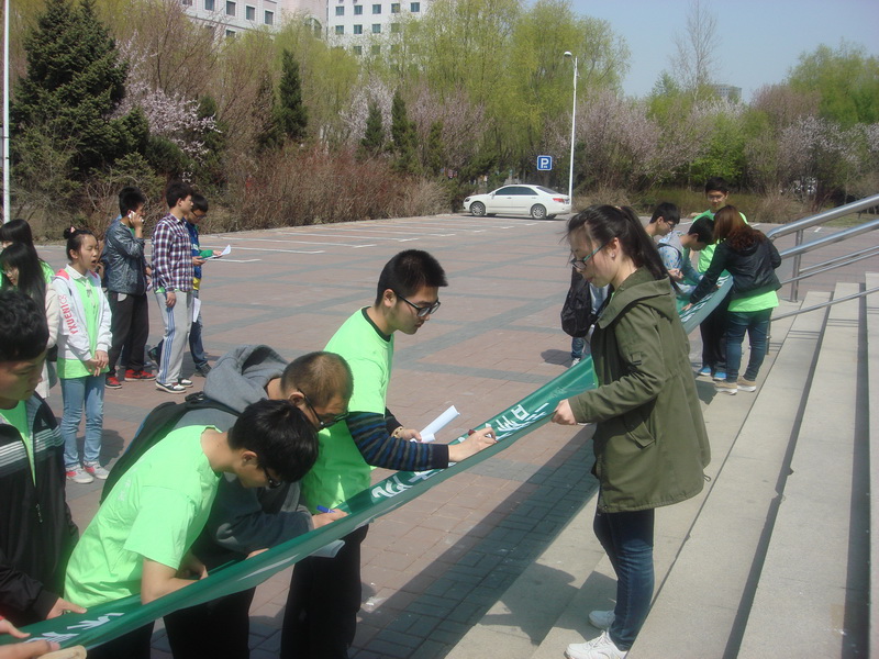 活动分为两大部分。活动伊始,社联工作部的工作人员致辞,阐释这次活动的主旨和中心,由林书宇同学对活动进行安排和分配。接着学生会主席周浩同学对这次的活动进行动员,周浩同学从小事讲起,倡导大家要保护环境,从点滴做起,真正的做到爱护自然。志愿者们深受感染,对几位同学的发言报以热烈的掌声。紧接着主持人让大家到条幅前庄重的签上自己的名字,同学们都认真地写下了自己的名字,表明自己对保护环境,热爱自然的决心。