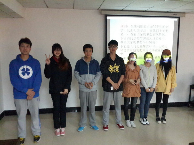 接下来是“许下你的愿望” 环节,主持人让同学们在便利贴上写出自己十年后的梦想,并把他们装入许愿瓶中,在十年后的班级聚会上看大家梦想的实现情况。大家纷纷写出了自己的梦想,仿佛一下子看到了十年后的自己。由班长和支书收集梦想条,并且抽出五名幸运同学,为他们颁发幸运观众奖,并与他们合影留念。大家玩得非常开心,就在欢声笑语中与我们的主题班会条幅合影留念,班会在大家大喊:“二班加油,我们加油!”中落下帷幕。