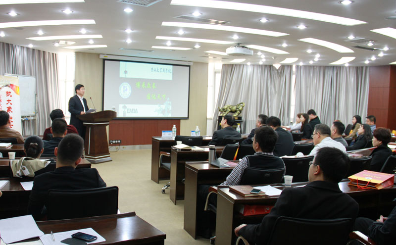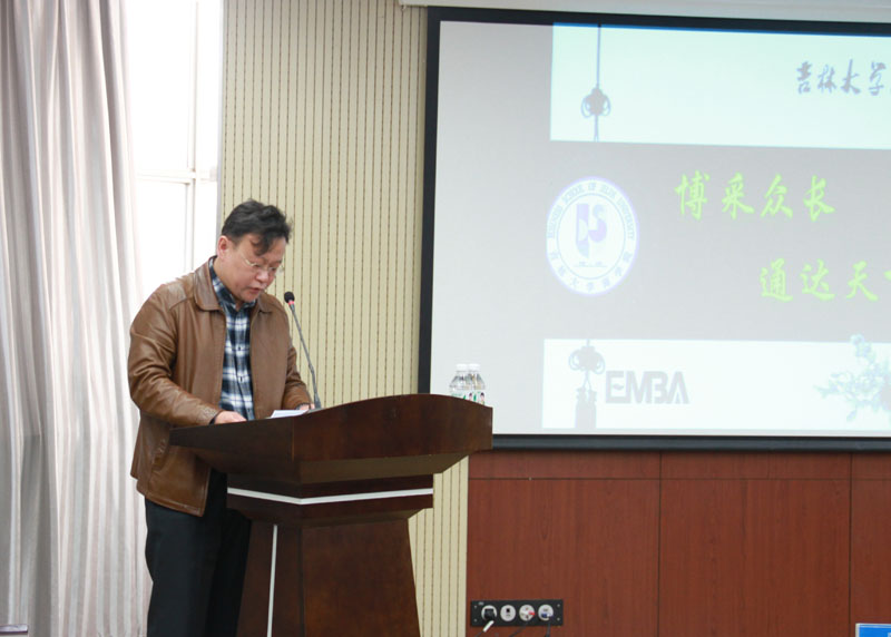 随后,EMBA学生代表、长春市第十一高中校长助理邢光政进行了发言。他首先代表所有的EMBA学生对各位新同学的到来表示热烈的欢迎和衷心的祝贺。接着,他向大家介绍了EMBA的学习经历、体验和收获,并真诚的祝愿大家在这个平台上能够分享成功的经验与喜悦,体会重返校园的纯粹与美好!