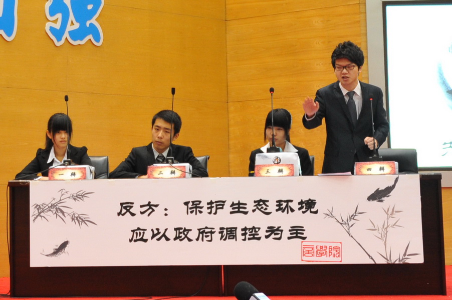 最精彩的莫过于针锋相对的攻辩环节,双方二辩、三辩机智灵敏,就政府和市场两个主体对经济利益和公众利益的侧重点以及自然资源的产权问题进行了讨论,思想的碰撞、伶俐的词语引起现场观众的阵阵掌声。反方二辩在攻辩回答中对辩题的深入剖析,给人留下了深刻印象。短兵相接的自由辩论依然是全场关注的重点,双方几位辩手虽然风格迥异,但都用自己的机智给我们带来惊喜。总结陈词阶段,反方四辩理性分析了对方辩手的逻辑线,同时也明确指出对方的错误,即经济利益和保护环境往往不能和谐,反而很大程度上是背离的。一席话有理有据,令人信服。