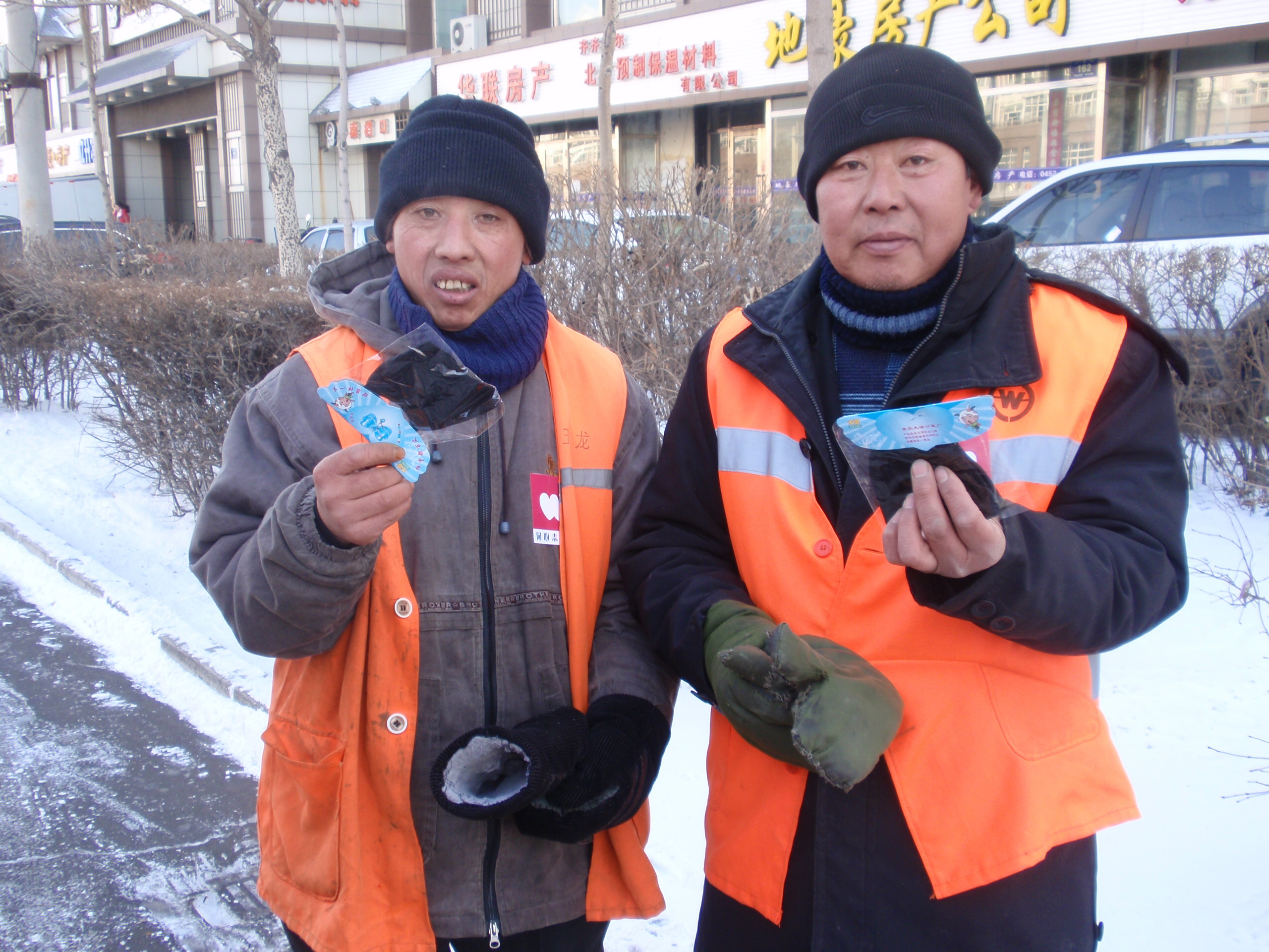 经过一些准备后,志愿者们带着胸前“同心志愿者”的标志和早已准备好的防风口罩上路了。他们走过他们所能找到的每一个环卫工人所在的路口,递上寄托着他们爱心的口罩,并为环卫工人们在胸前贴上同心志愿者的标志以示祝福。