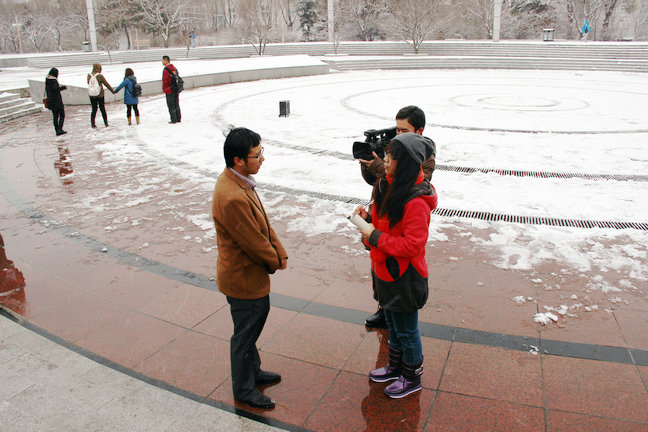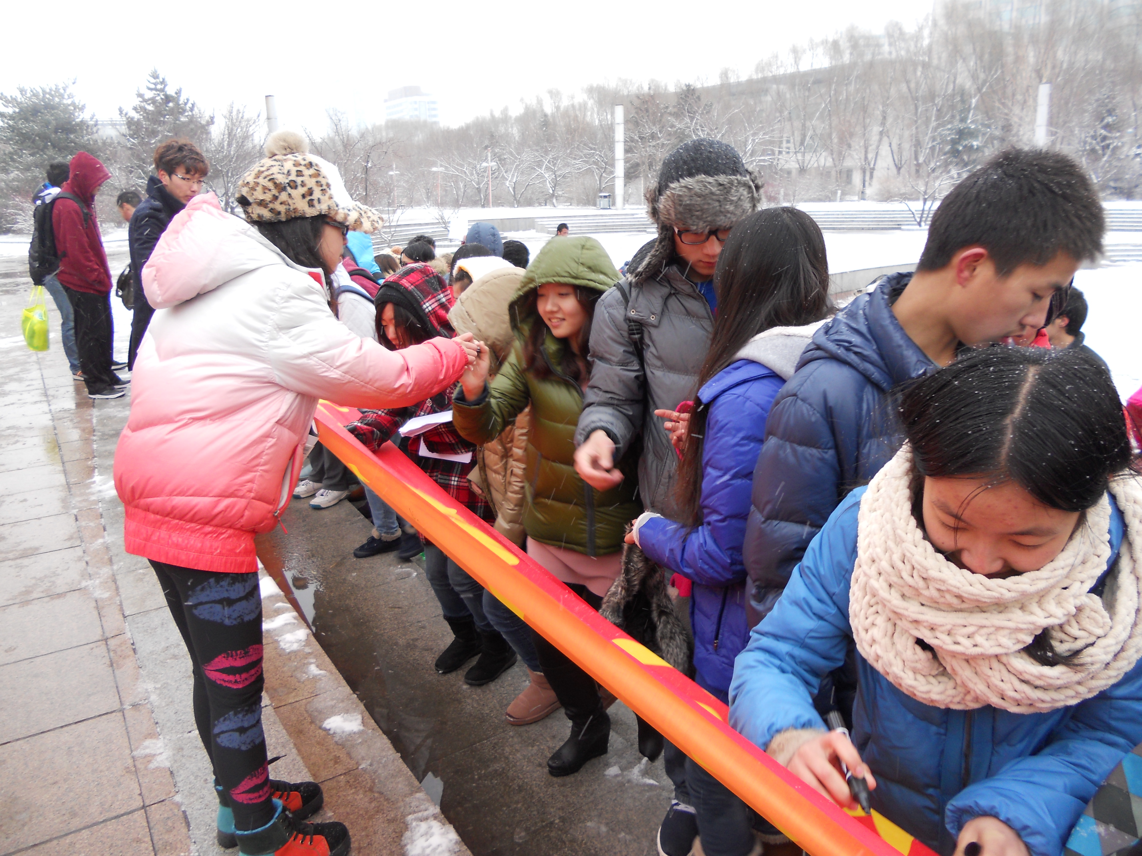 之后,荣诗达老师为大会做展望发言。他对同学们能顶着凛冽寒风进行宣誓的精神予以高度赞赏,同时也希望同学们能够继续发扬这种精神,用自己的青春与智慧,创造商院的辉煌,为吉大争光。大会最后一项,同学们在宣誓条幅上签下自己的名字,以铭记作为当代大学生应肩负起的职责与使命。荣老师在大会结束后接受了城市晚报的采访。