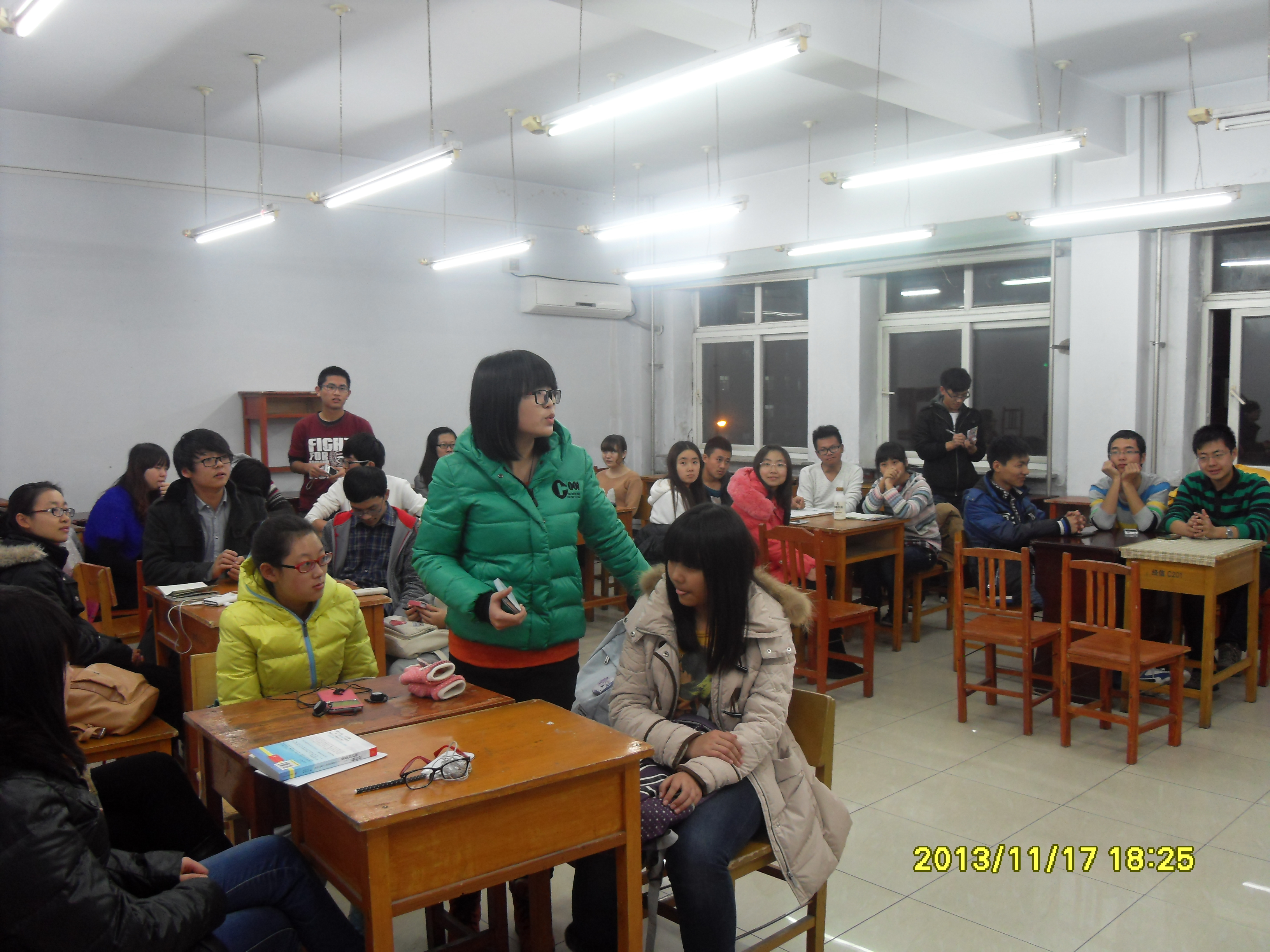 接下来,第二位主讲人范红叶同学带领大家走进了中国古代小说发展史,她借几部经典古代小说的讲说对中国古代小说发展史进行了概述,并借一句小诗来与现场同学互动,加深了同学们对主讲内容的印象并拓宽了同学们的知识面。在之后的讨论建议中,范红叶同学的讲说内容及现场表现也获得了同学们的一致好评。