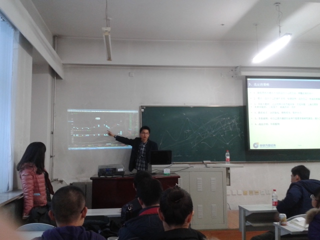 向阳师哥不仅从专业的角度细致地为现场同学进行了炒股知识的普及,耐心地对多只股票进行了宏观分析以及技术分析,还传授了一些独家判断股票走势的技巧,他讲述了股票的四大领域切线﹑均线﹑通道﹑波浪以及关键要素量﹑价﹑时﹑坚,强调趋势的力量,要学会顺势而为,也为大家讲解了如何运用均线,20日线,黄金分割,对称思想的方法预测股票的动态变化以及如何感知一些如PPI,PMI,进出口等重点经济数据,深入浅出地分析了股票投资的基本面和复杂面的关注重点。