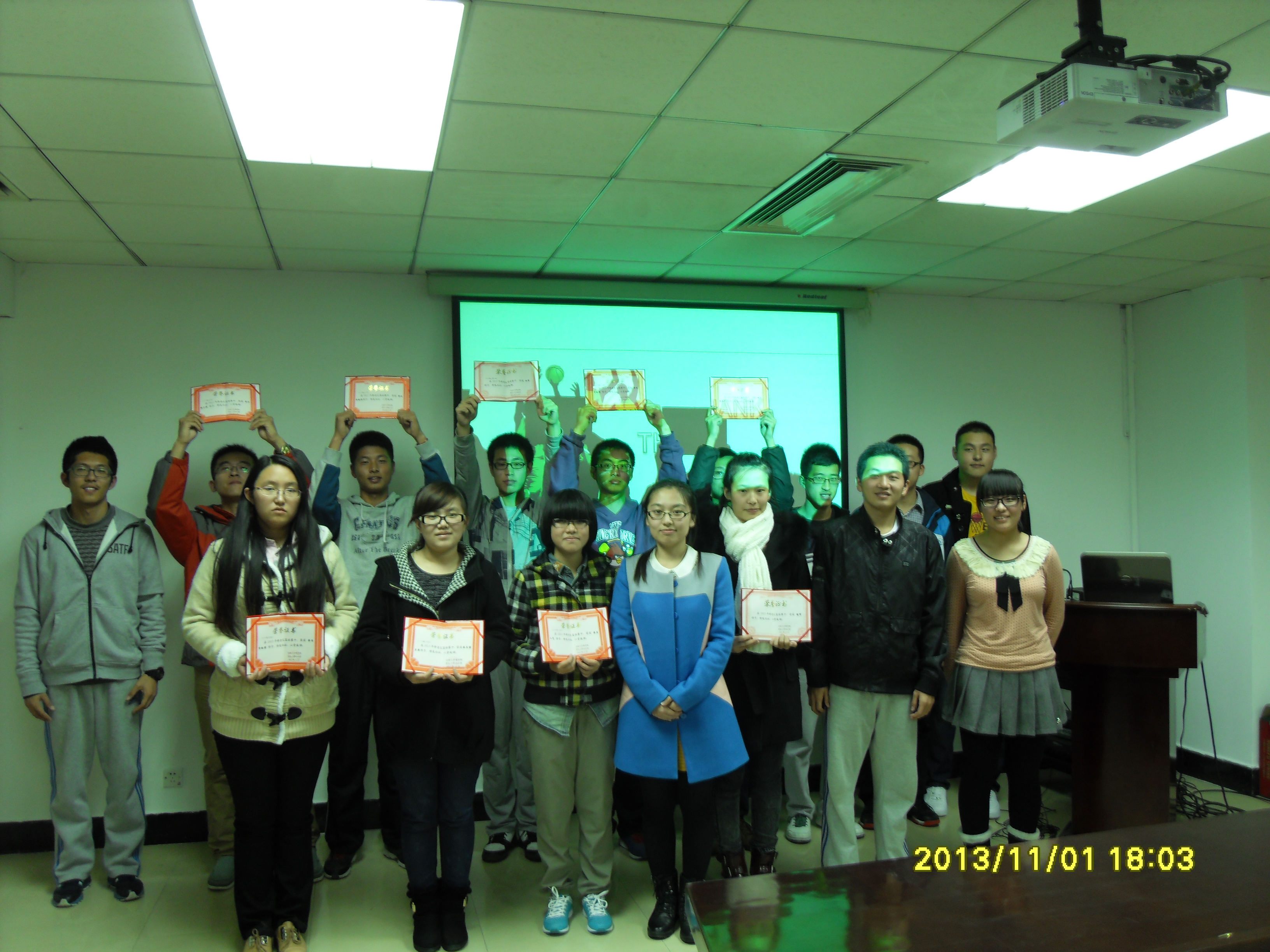 11月1日下午6点,77779193永利官网2013年新老生篮球赛颁奖典礼在东荣A306拉开帷幕,出席本次典礼的嘉宾有:13级辅导员金博老师、10级团委副书记房汛、11级学生会主席周浩以及体育部全体成员和获奖班级代表。