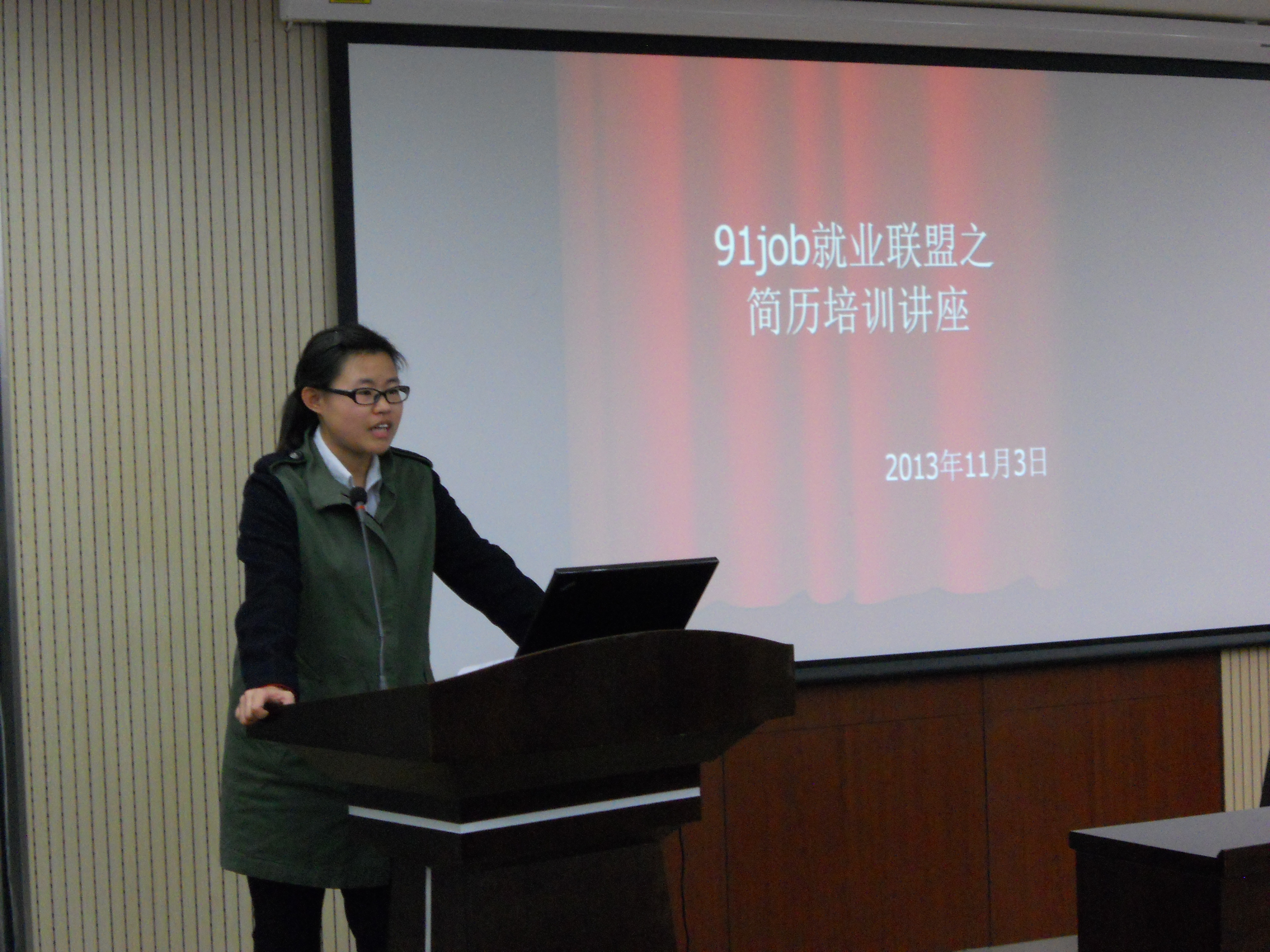 为给走上求职之路的学子们增加核心竞争力,并积极推动大学生就业工作的开展,11月3日由91job求职联盟举办的简历技巧培训讲座于11月3日6点半在东荣大厦准时召开,11级财务管理专业的李牧宸同学作为主讲人参加了此次讲座。