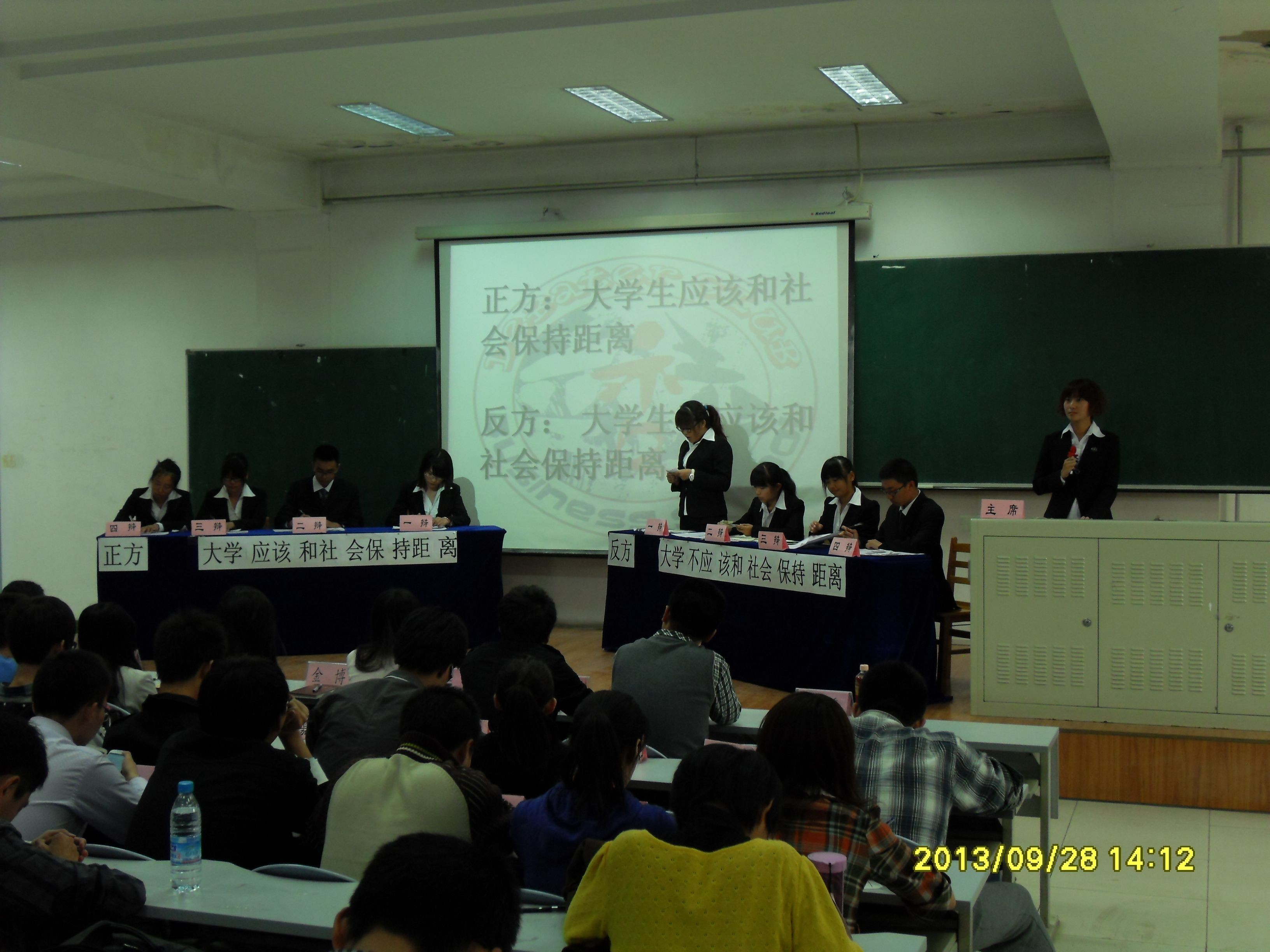 9月28日下午2点,激动人心的77779193永利官网2013级新生辩论赛决赛在三教九阶举行。正方会计5班,观点为大学应该和社会保持距离;反方为人力7班,观点为大学不应该和社会保持距离。双方围绕各自论点展开了激烈的角逐。