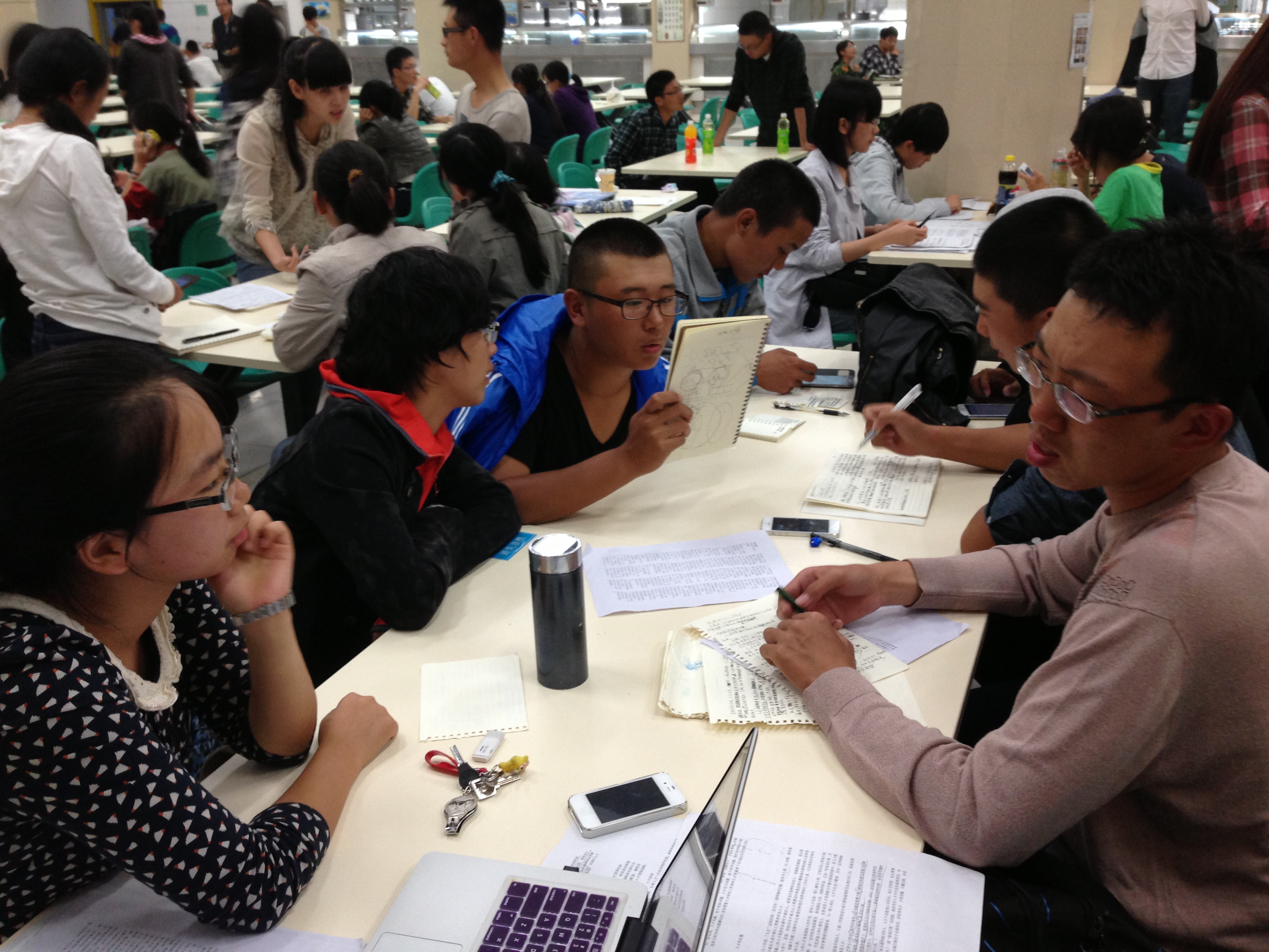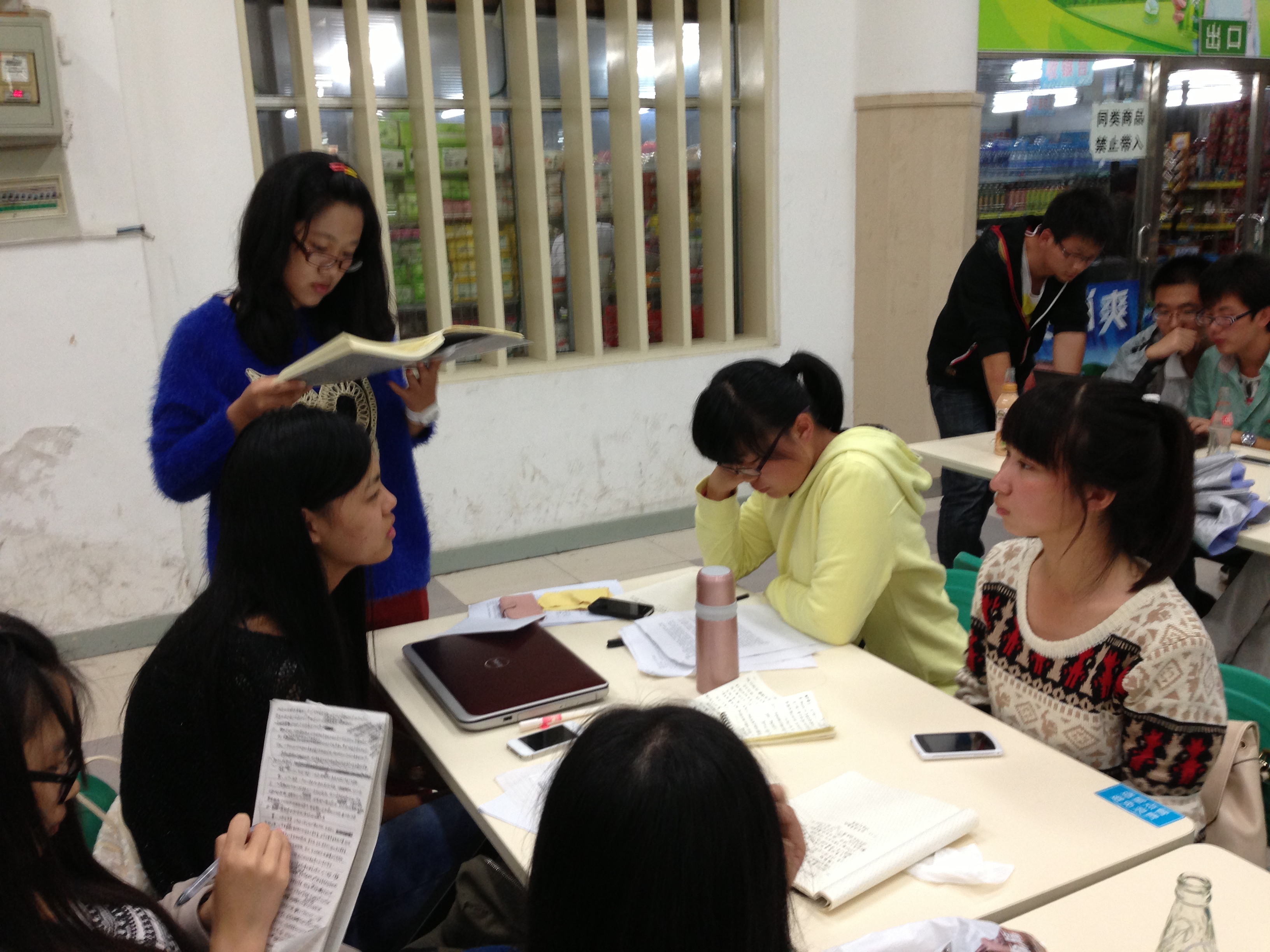 91日到97日,2013级参与辩论的同学们将自己的休息时间几近全部地用在了准备即将到来的辩论比赛上。从军训结束晚上8点半一直到深夜的11点,他们或集体讨论、总结资料、交换观点,或独自浏览网页、翻看报纸杂志,为自己的辩题寻找依据。夜晚的莘子园,吃饭的人群早已离开,只留下这样一群为在辩论场上展现自己,实现梦想,超越自我的战士们。每个小组的成员围坐在一个个饭桌旁,他们有人奋笔疾书,有人上网查资料,有人绞尽脑汁思虑对方的提问,有人反复琢磨己方的观点。桌面上罗列着一叠厚厚的纸张,上面布满了他们讨论后的文字,密密麻麻,犹如铭文般刻下了他们进入大学后寻梦的痕迹。