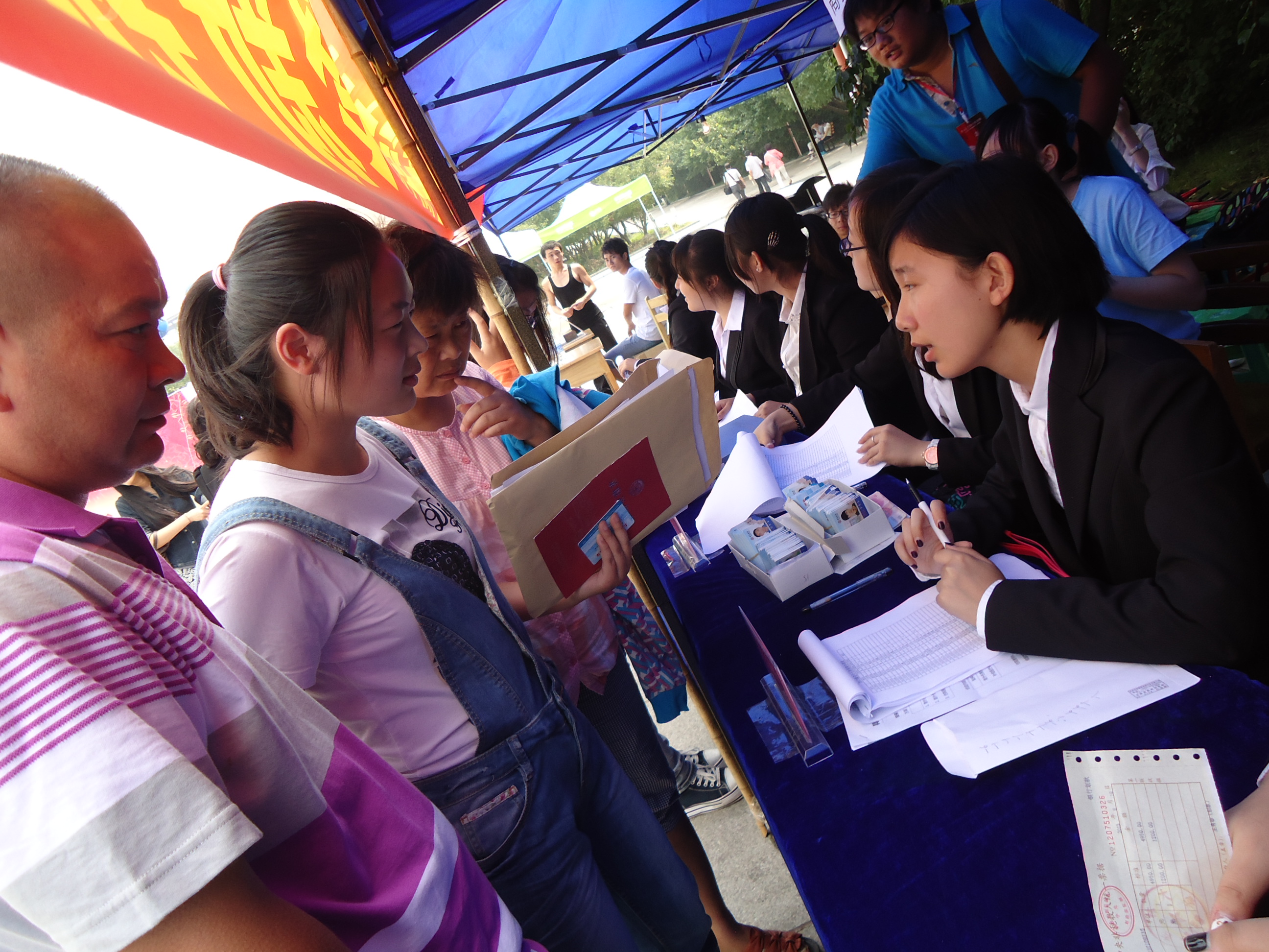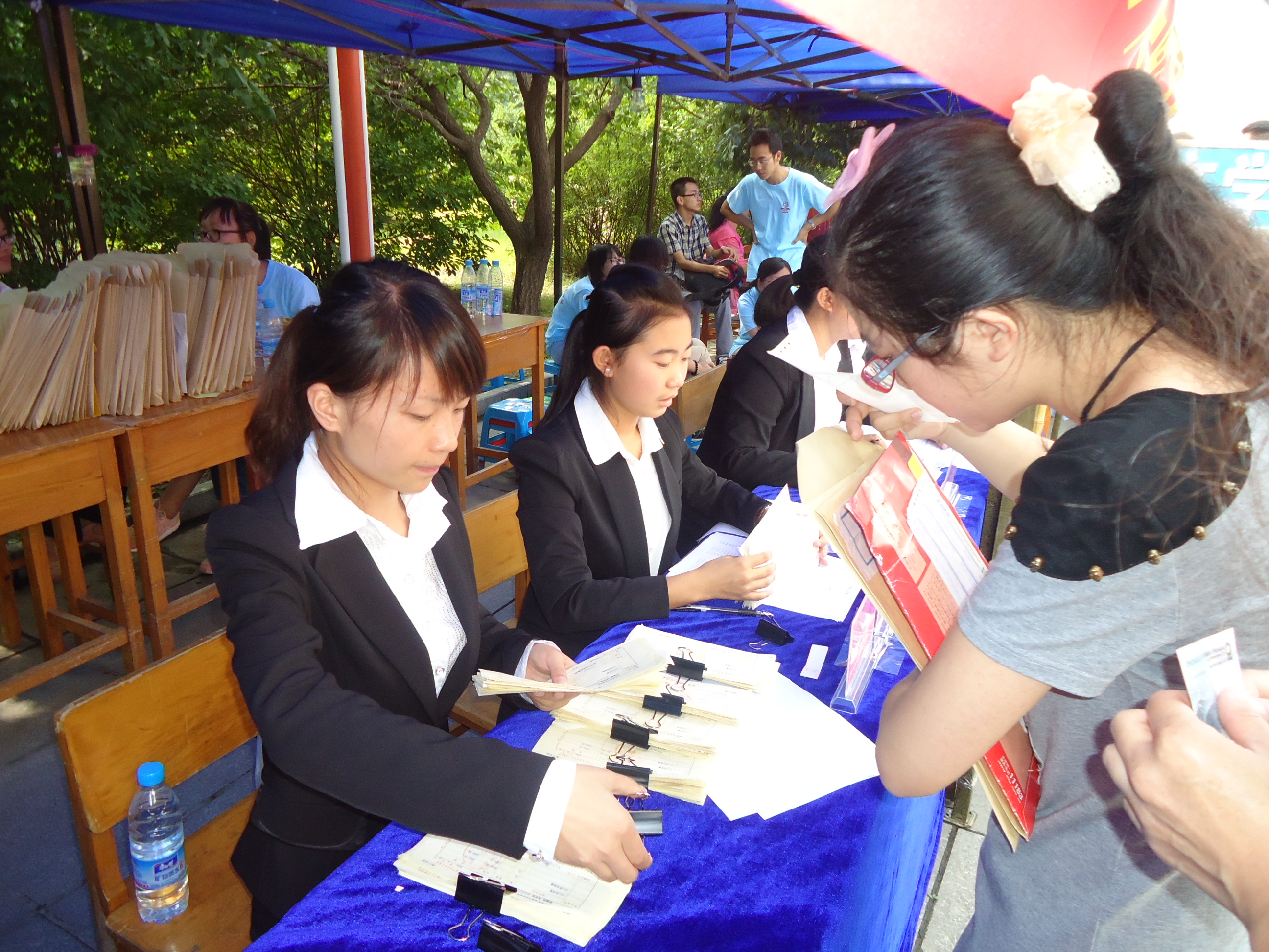 今天起初阴着天,为前台工作工作人员带来了温度上的最大支持。穿着正装的12级女生们面带微笑,为每位新生及家长服务,耐心回答他们的每一个问题;新生的一声声学姐,一句句谢谢,都是对我们工作的最大认可。