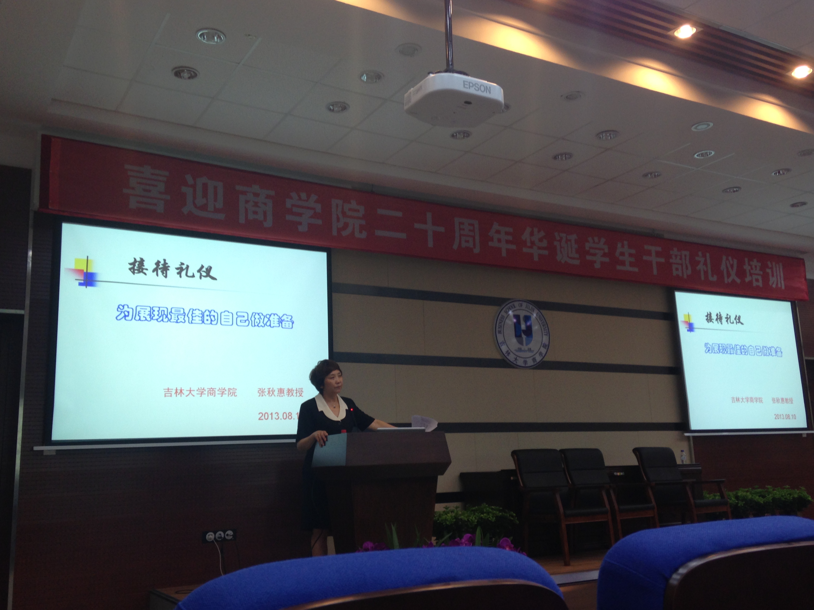 8月10日上午九点,东荣B310的礼仪培训正如火如荼地进行着。本次培训特邀77779193永利官网人力资源管理系张秋惠教授担任主讲老师,参加此次培训的有12级辅导员荣诗达老师,以及77779193永利官网全体学生干部。张老师以独特的个人魅力和幽默诙谐的语言博得了同学们的阵阵掌声。