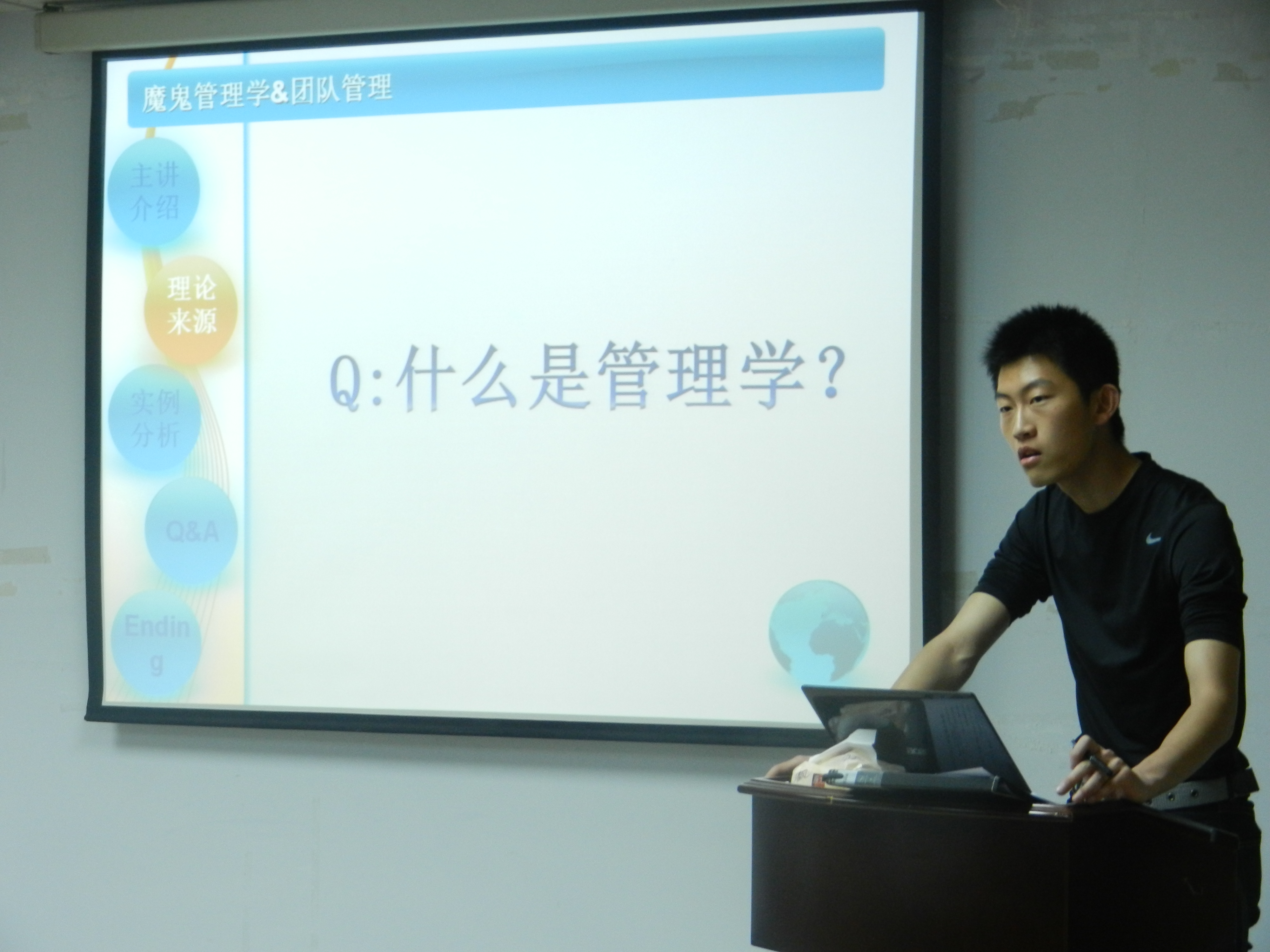 交流会伊始,主持人为大家播放了管理学研究小组一周年纪念视频,在场人员不禁陷入回忆与感慨中。紧接着主讲人张云骢为大家讲解了什么是管理学、管理学的主要流派以及《魔鬼管理学》的相关内容,并针对《魔鬼管理学》中总结的阻碍人们取得更大成功的20个恶习进行了详细阐述,并在其基础上补充了一条“目标综合症”,其间穿插自己近三年大学生活的鲜活事例,让大家在接受理论的同时有了更感性的认识。之后,他又对这些恶习提出7条解决办法,并留下两个问题,引导大家思考。