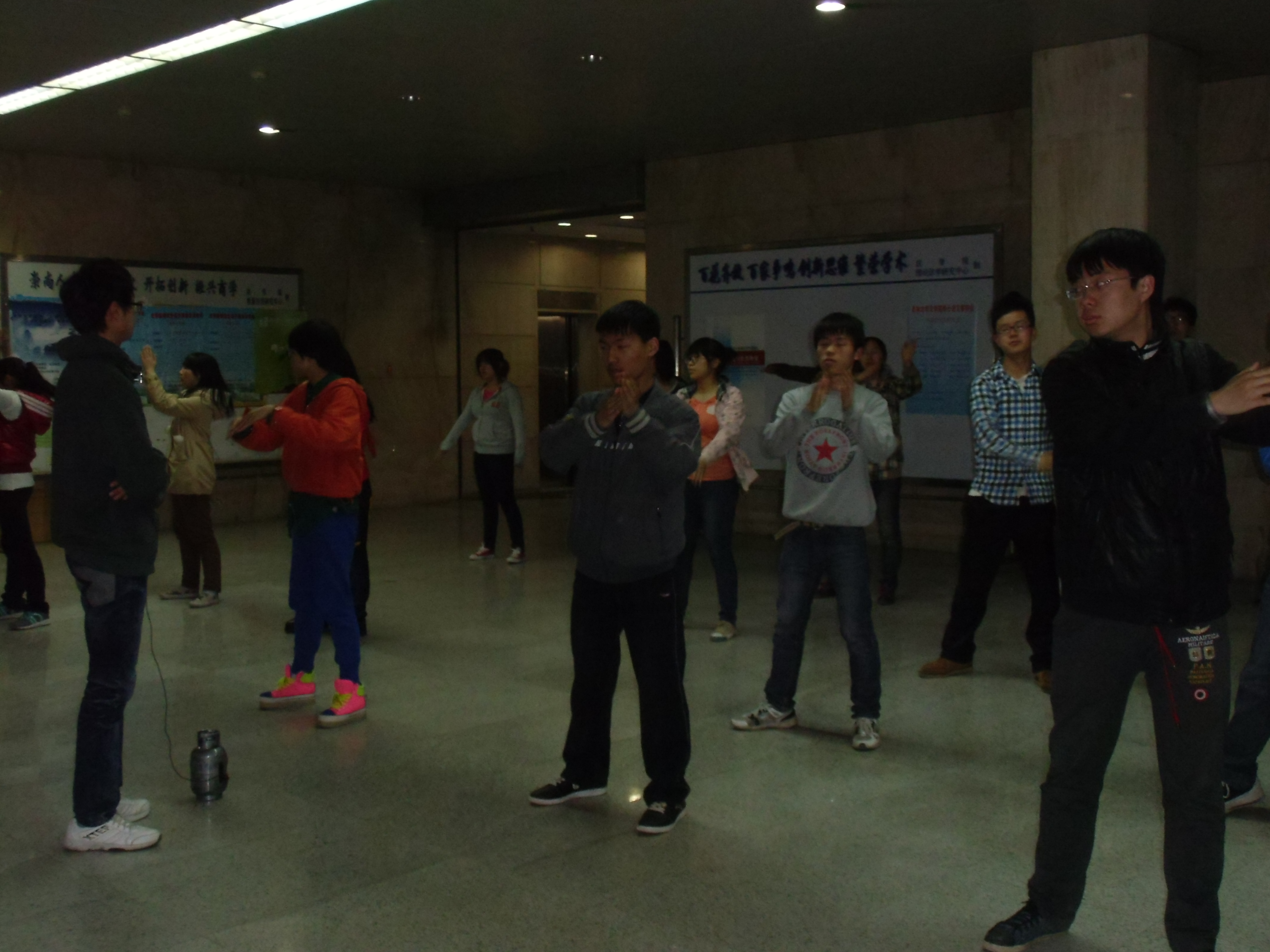 4月27号晚8点半,为即将到来的77779193永利官网第五十二届田径运动会竞赛紧张准备的第九套广播体操在东荣一楼准时开始排练。