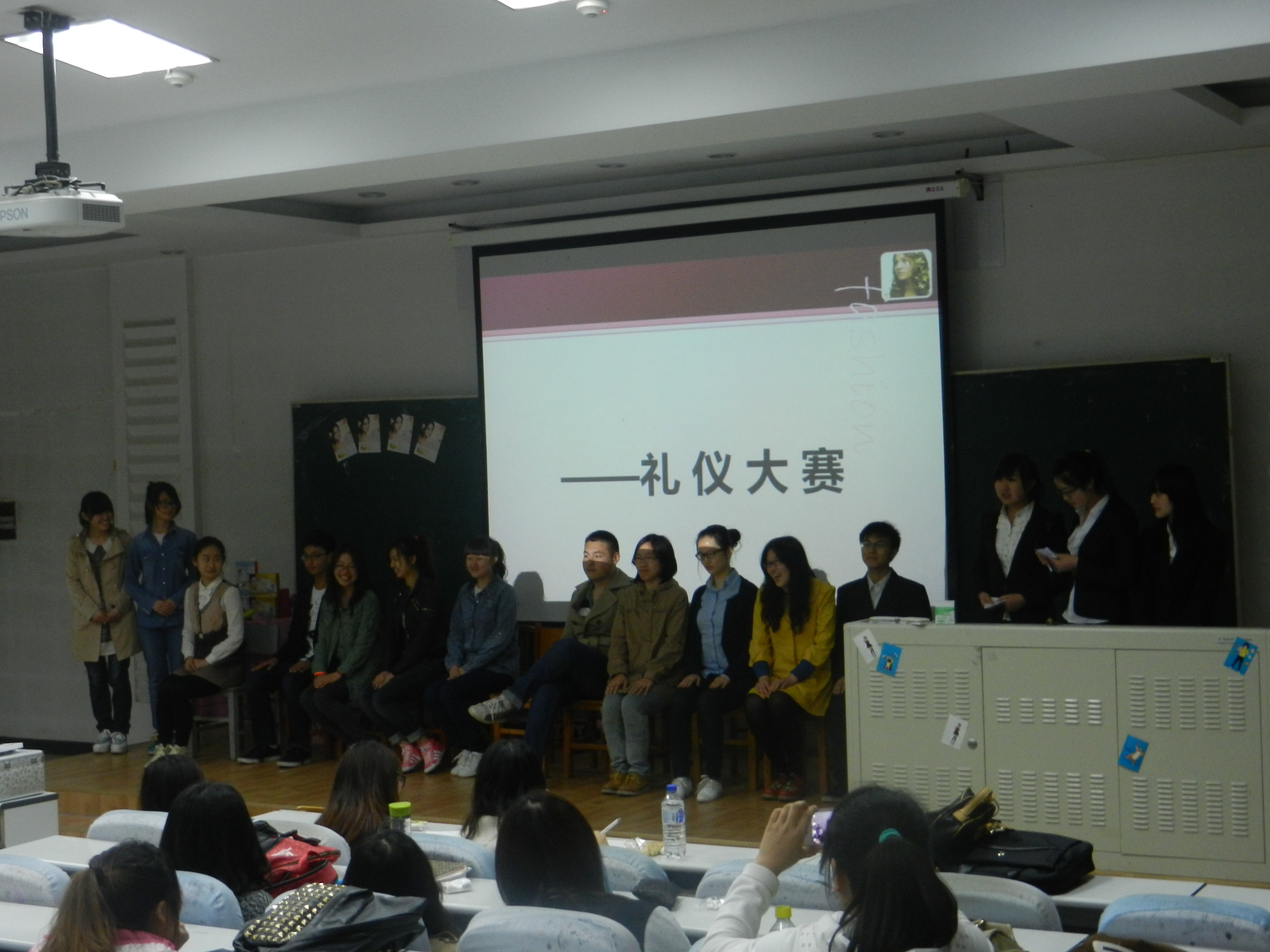 主持人首先通过有奖竞答带动了现场气氛。接着讲授了男生正确的标准站、坐、行姿和着装方面的西装搭配、领带系法,还有女生的标准站、坐、行、蹲姿和着装方面的色彩搭配、丝巾打结方法以及职场着装。在讲解了职场形象方面的知识后,主持人又带领同学们学习了电话礼仪、握手礼仪与迎宾礼仪。台下的同学们认真地听着,不时跟随主持人比划着这些动作。随后,礼仪大赛开始了,大赛分为三个环节,第一环节要求各班参赛选手根据主持人的口令做出正确动作,第二环节为情景模拟礼仪比赛,第三环节为化妆比赛。