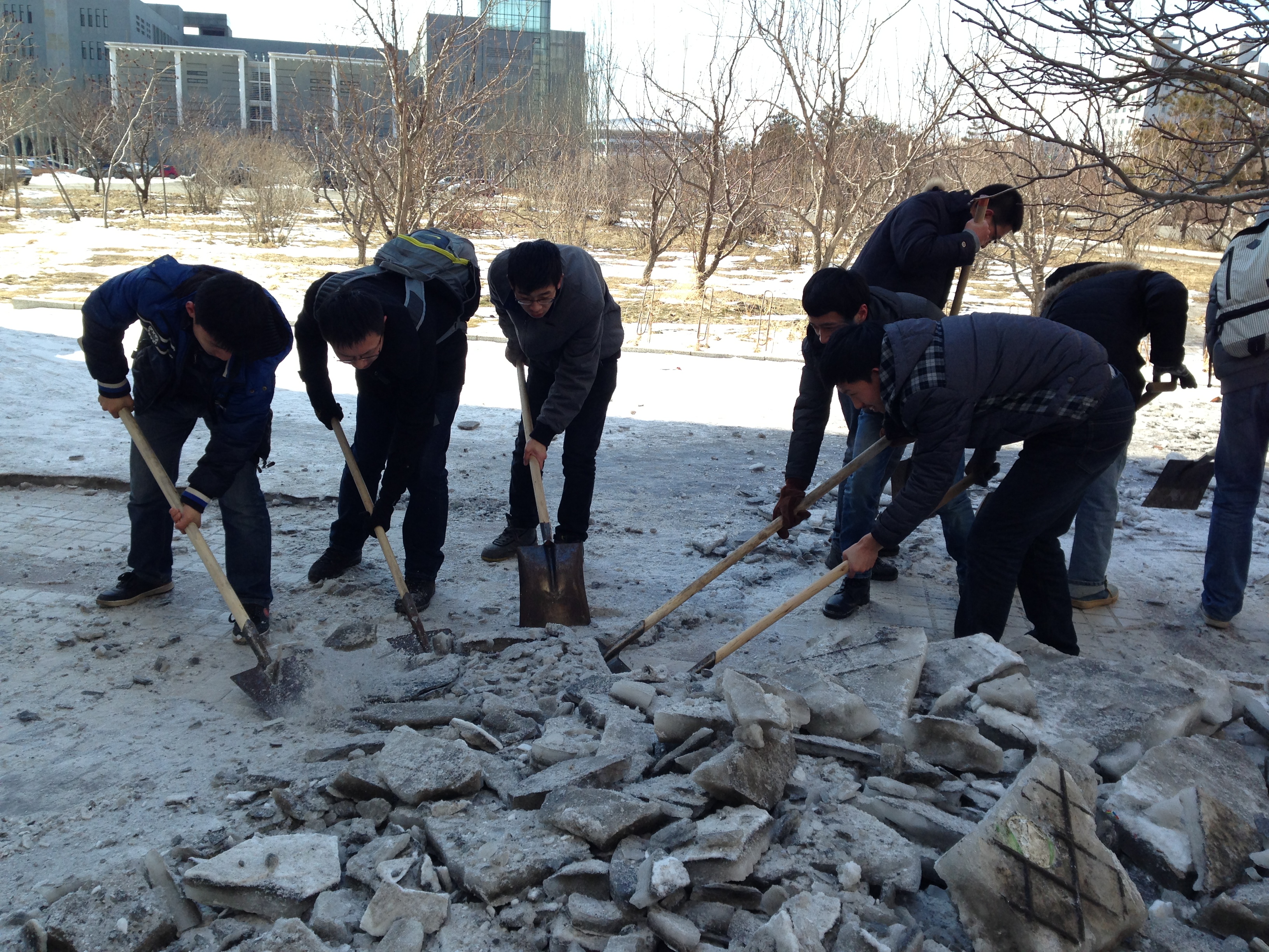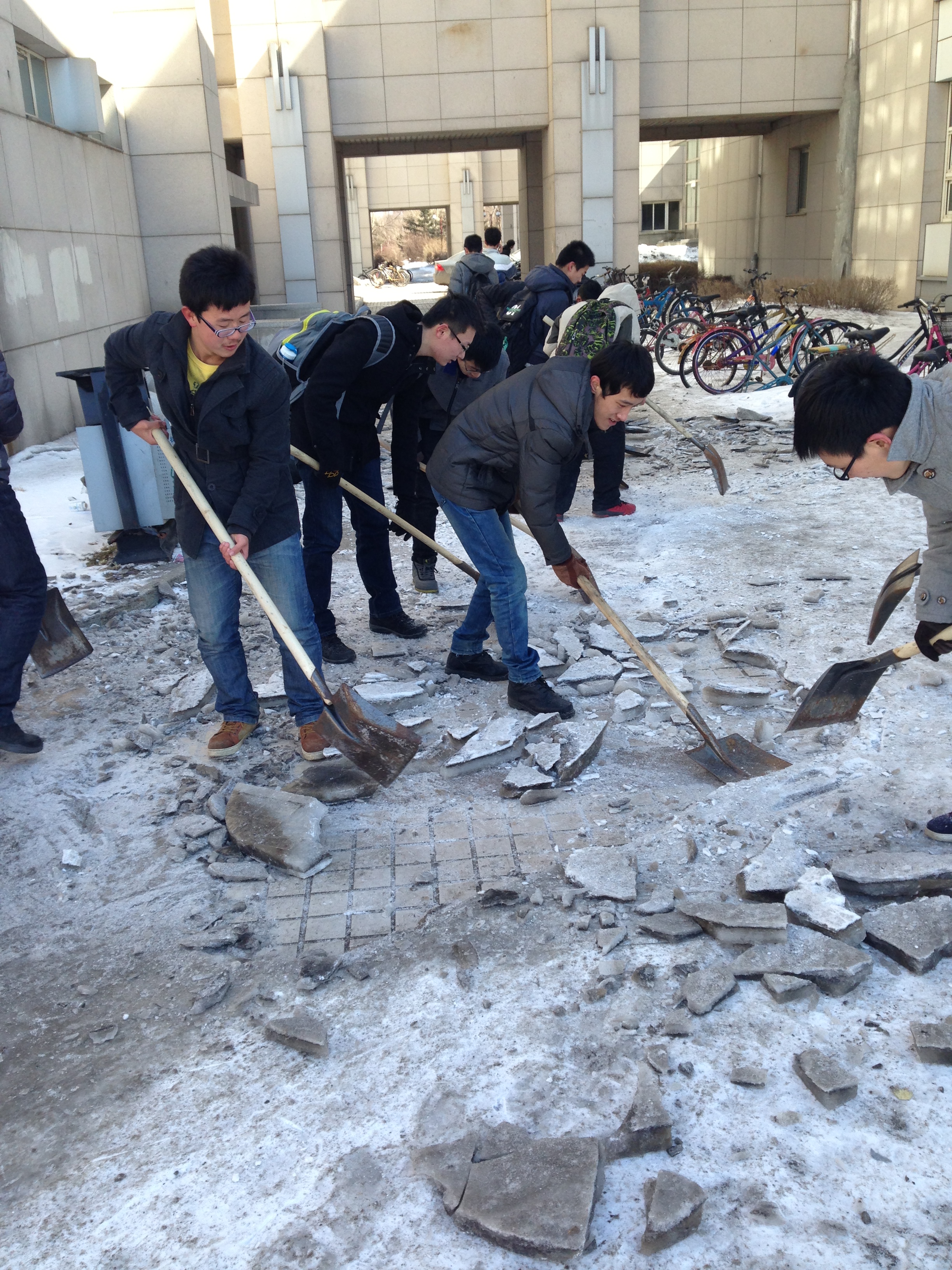 继上一次同协为了方便老人出行在吉大家属楼的“破冰”活动,我们的志愿者看到三教和图书馆前的空地因暴雪天气导致冰雪堆积,给广大师生的出行带来的极大困扰,便决定继续开展我们的破冰之旅,将三教和图书馆前的空地做为第二次破冰的地点。