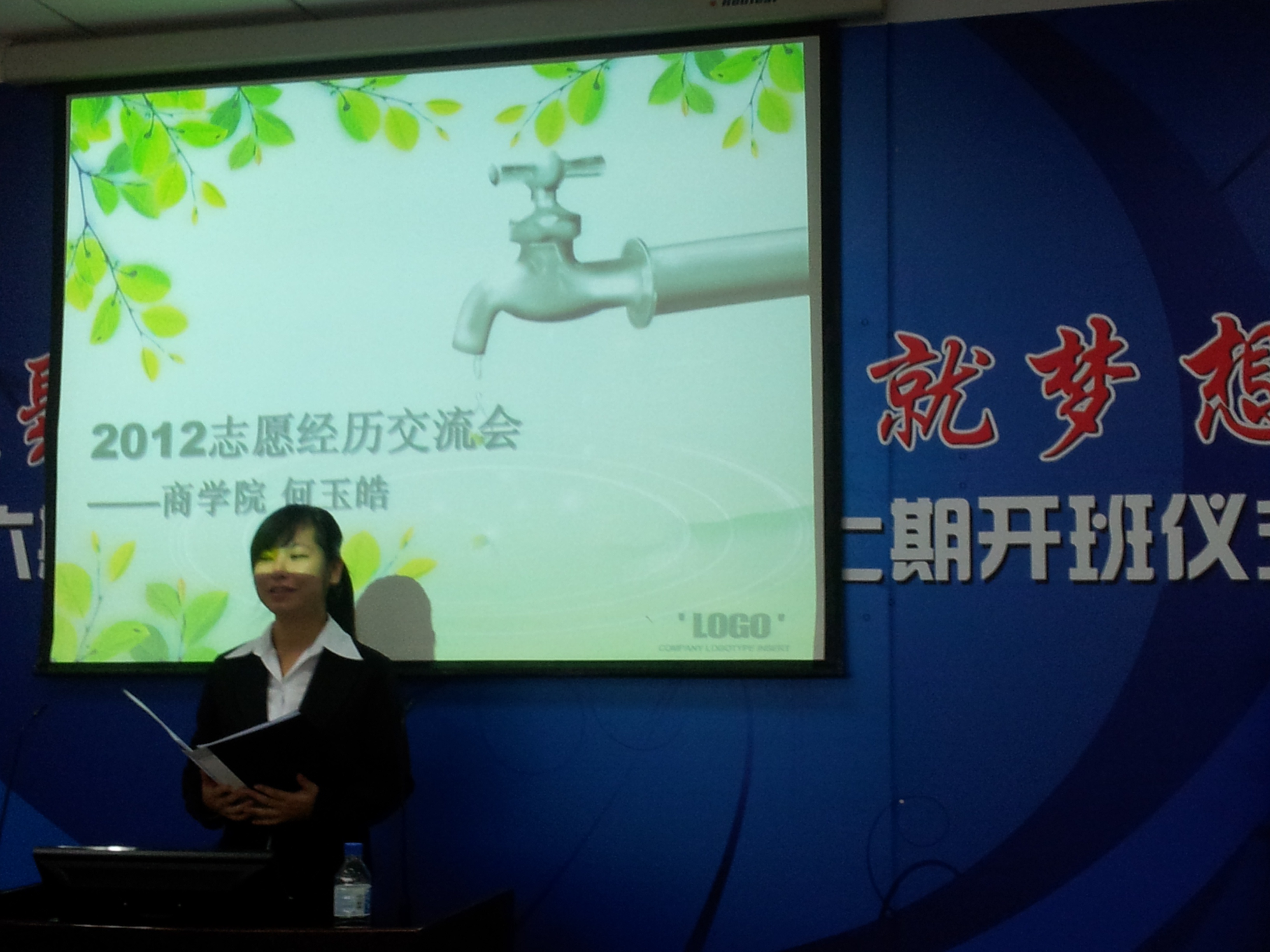 首先,管理部副部何玉皓分享了她的各种志愿活动经历,寄语12级同学应保持一颗积极向善的心,时时与爱同行。她还指出每一次志愿活动或许不能带给自己很大收获,但许多因此受益孩子心中已悄然种下一颗梦想的种子。接下来,秘书处副部于素平与同学们交流了她的志愿经历,让观众看到了她的成长,并以“希望是健康社会的生命之光,是黑暗世界的终结之光”作结,鼓励同学们积极投身到志愿者活动中。