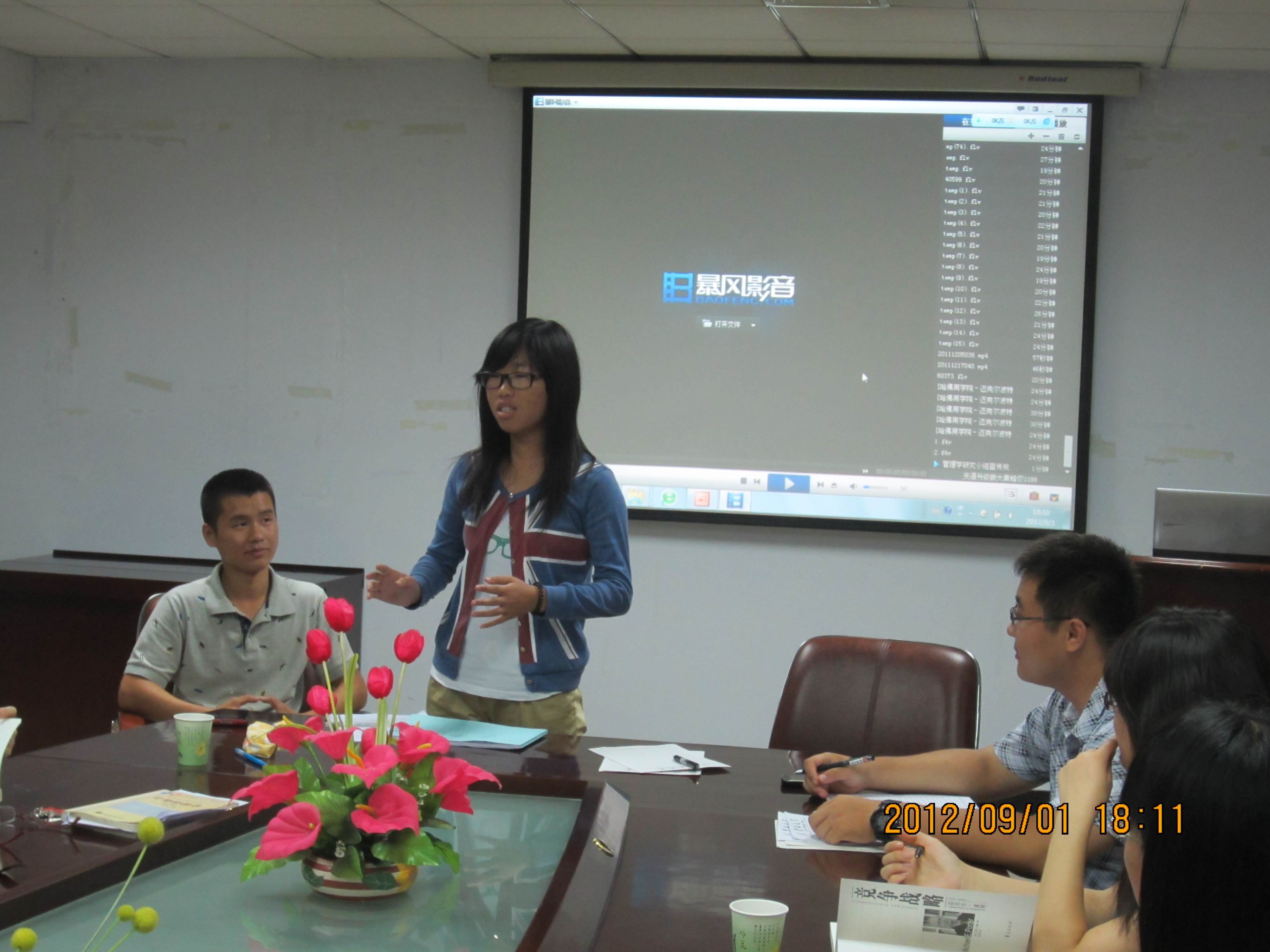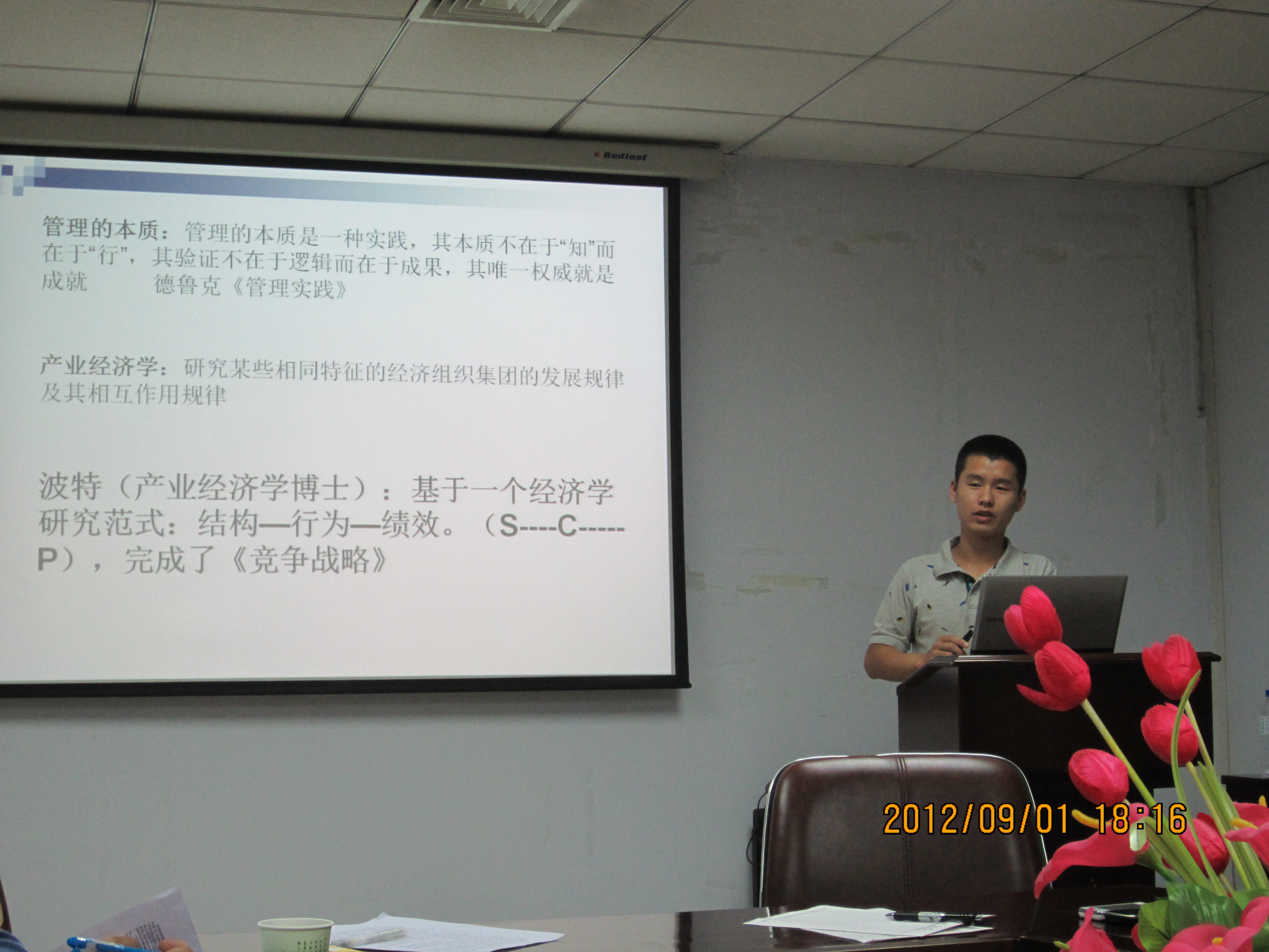 2012年9月1日晚6点,在东荣大厦A区306会议室,管理学研究小组举办了小学期第一次读书活动—《竞争战略》第一讲。本次会议由10级财务管理班刘丹阳主持,10级人力资源管理班王洋担任主讲,企业管理研究生任园园作为特邀嘉宾。
